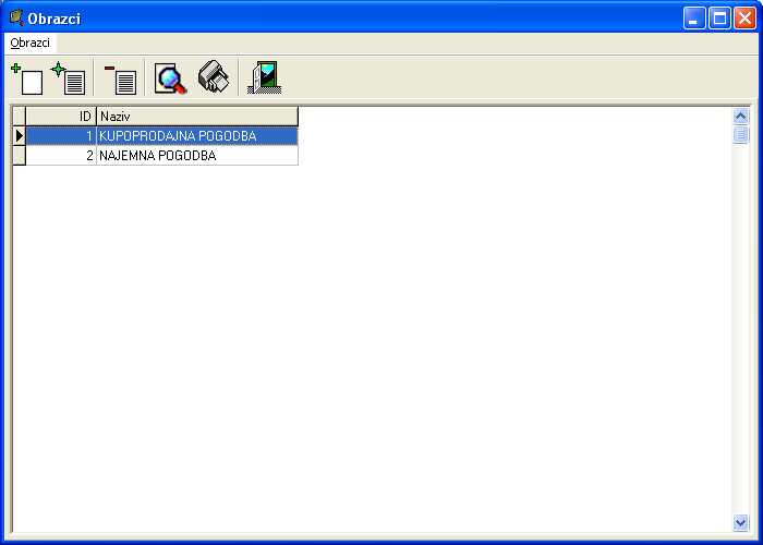 - Vrste obrazcev: preko menija Obrazci/Vrste odpremo vnosno okno za vnos vrst obrazcev. Vpišemo vse vsebinsko ločene vrste dokumentov, ki jih želimo vpisovati. Glej sliko.